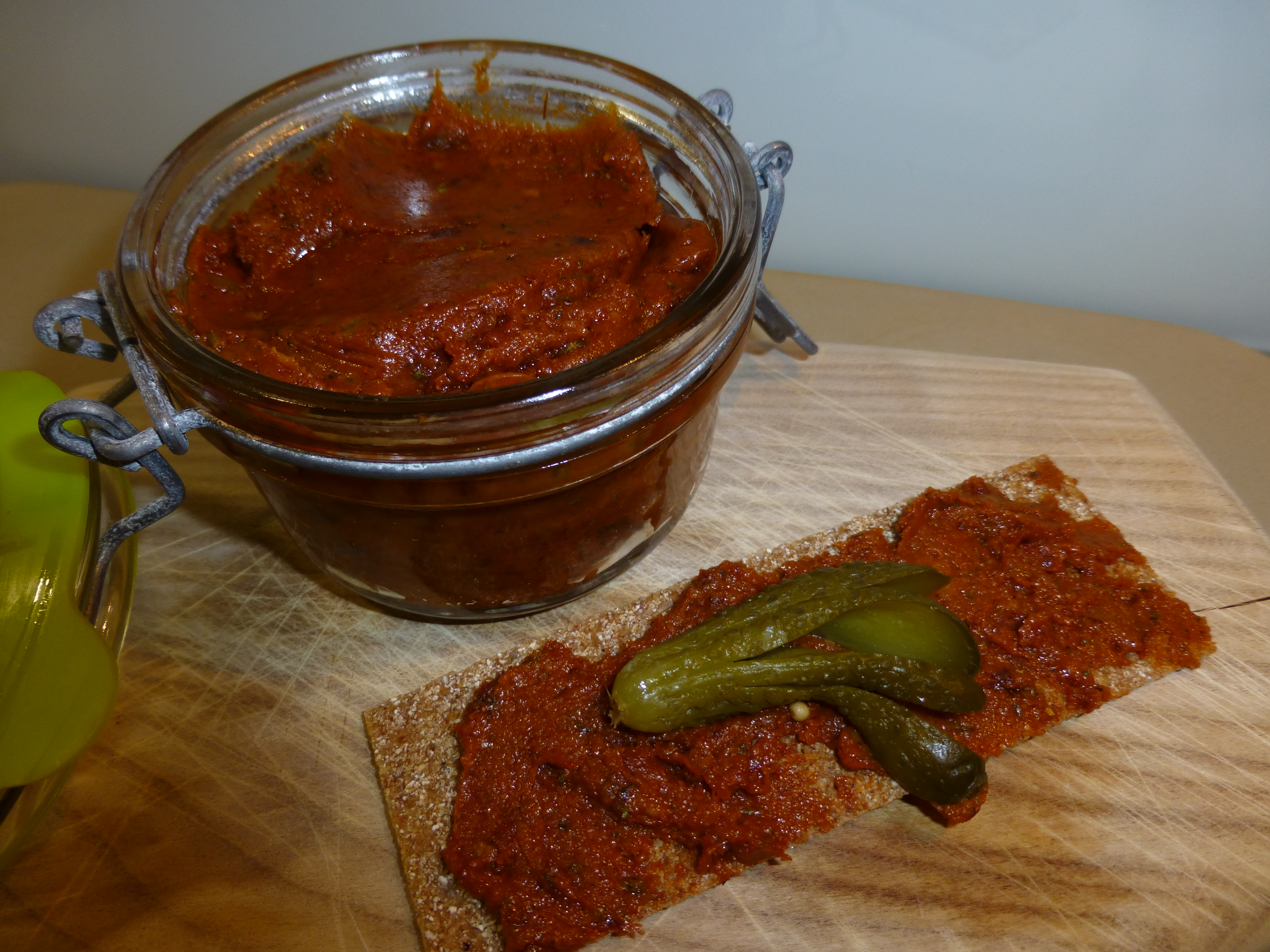 die Tomaten mit kochendem Wasser übergießen, währenddessen die Körner in der Pfanne leicht anrösten. Diese in der Küchenmaschine mahlen. P1080416Herausnehmen und die übrigen Zutaten im Mixer fein zerkleinern.  Danach die gemahlenen Sonenblumenkerne noch einmal untermischen. Ergibt zwei Gläser, geht fix und schmeckt sehr lecker auf Knäcke oder kräftigen Broten. Auch statt Butter verwenden oder zum Würzen für Suppen und Soßen verwenden…..