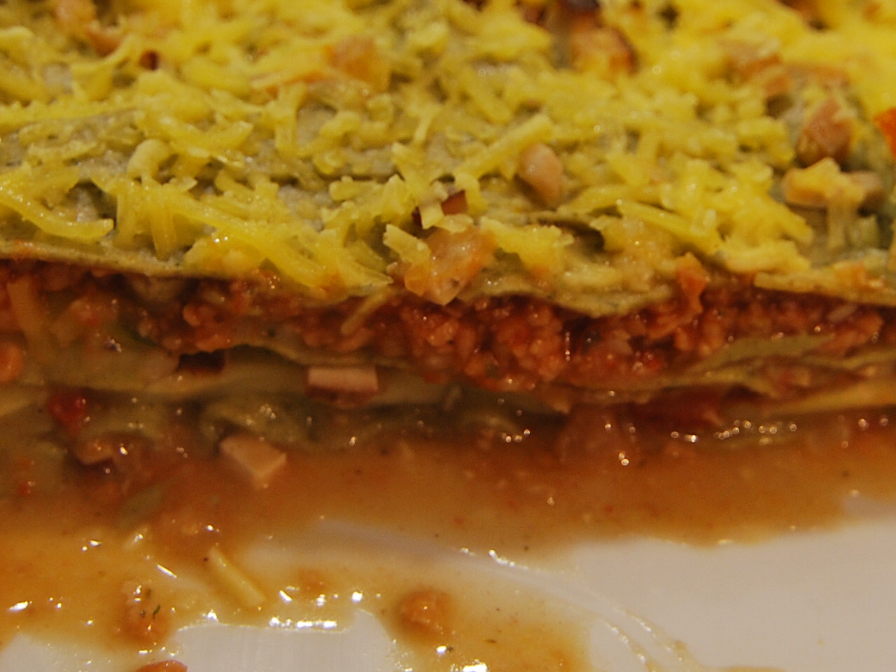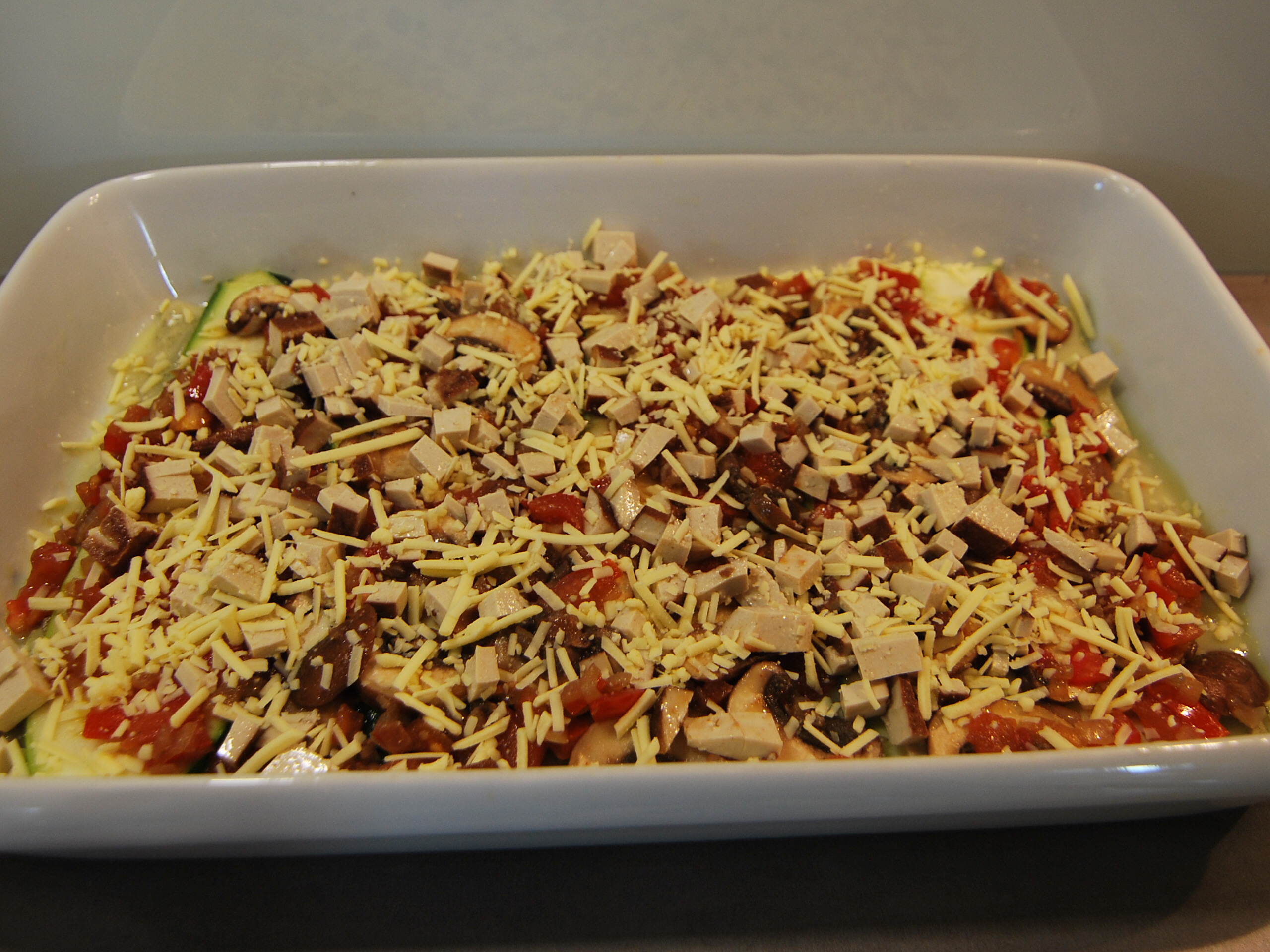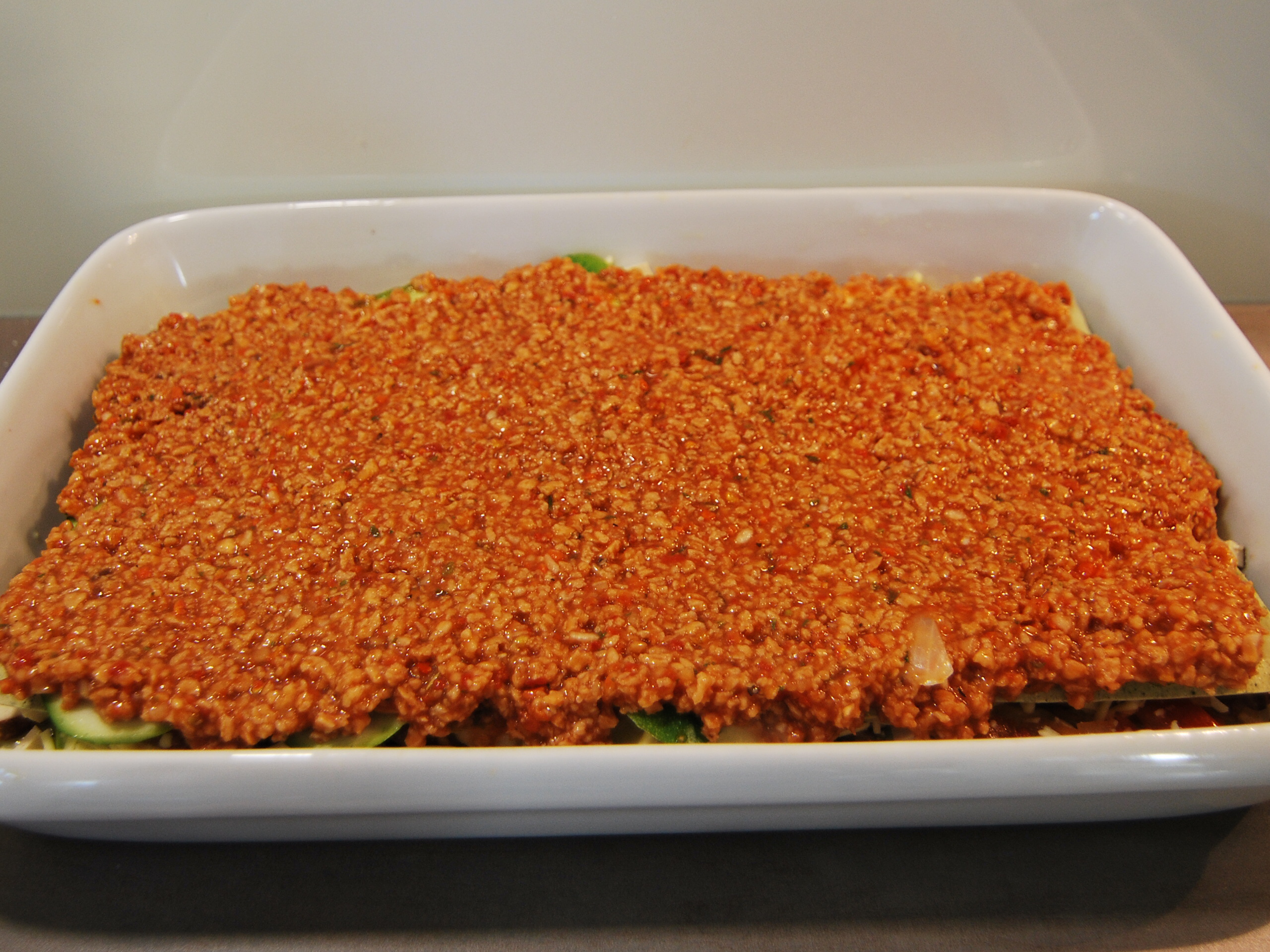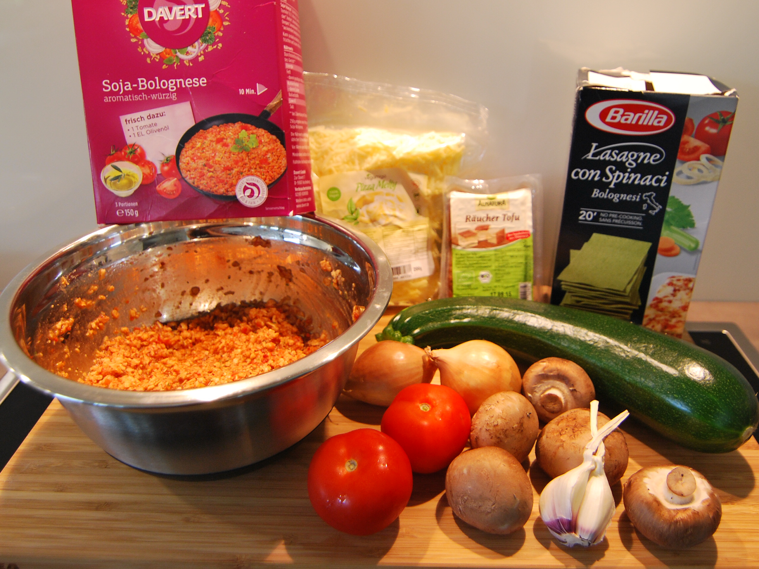 Wer es einfacher mag: fertiges veganes Hack nehmen, mehr Streukäse und ohne Käsesauce, Gemüse kann varieren, Stangensellerie, Zucchini…. alles geht, was schmeckt…..