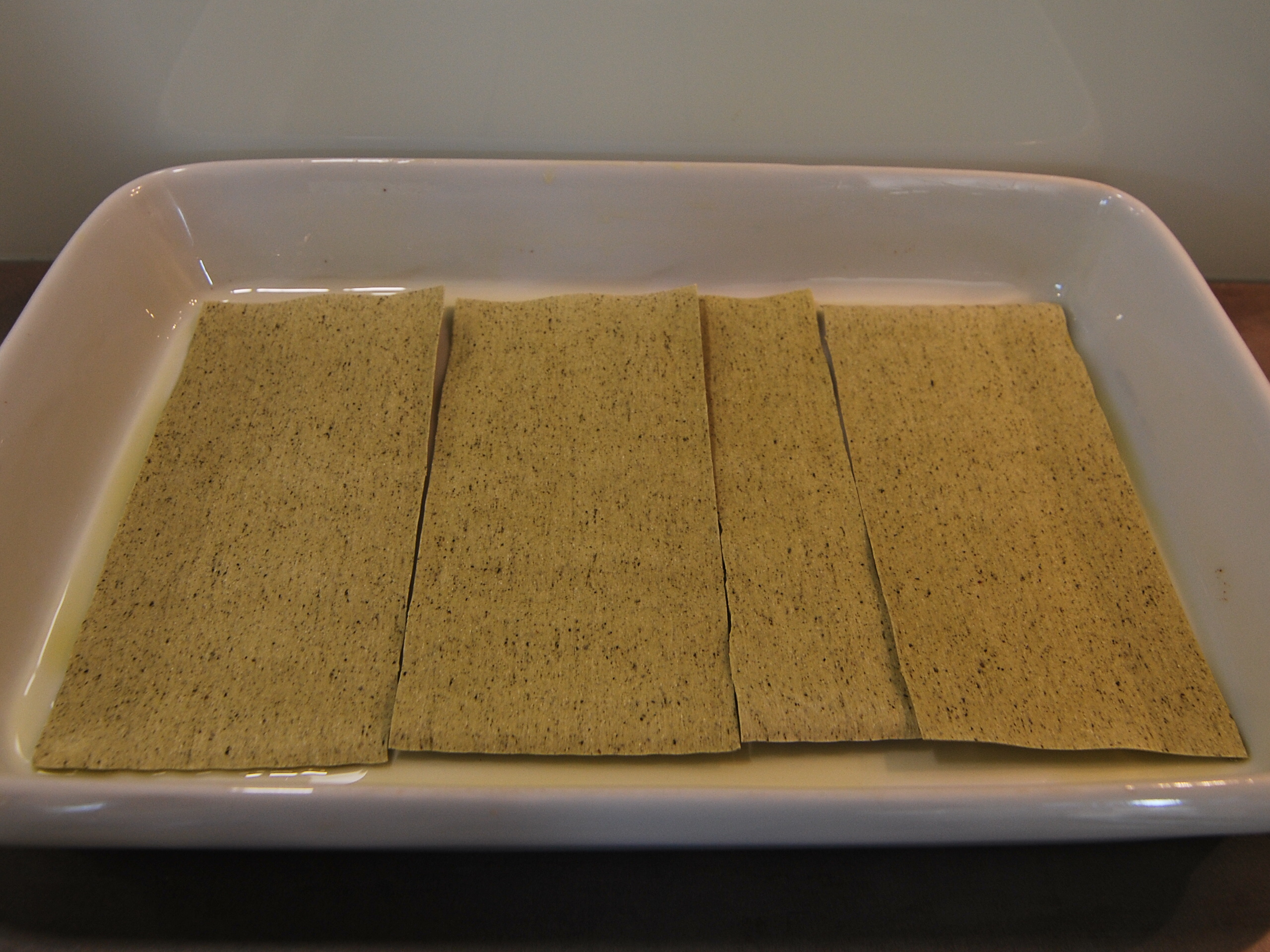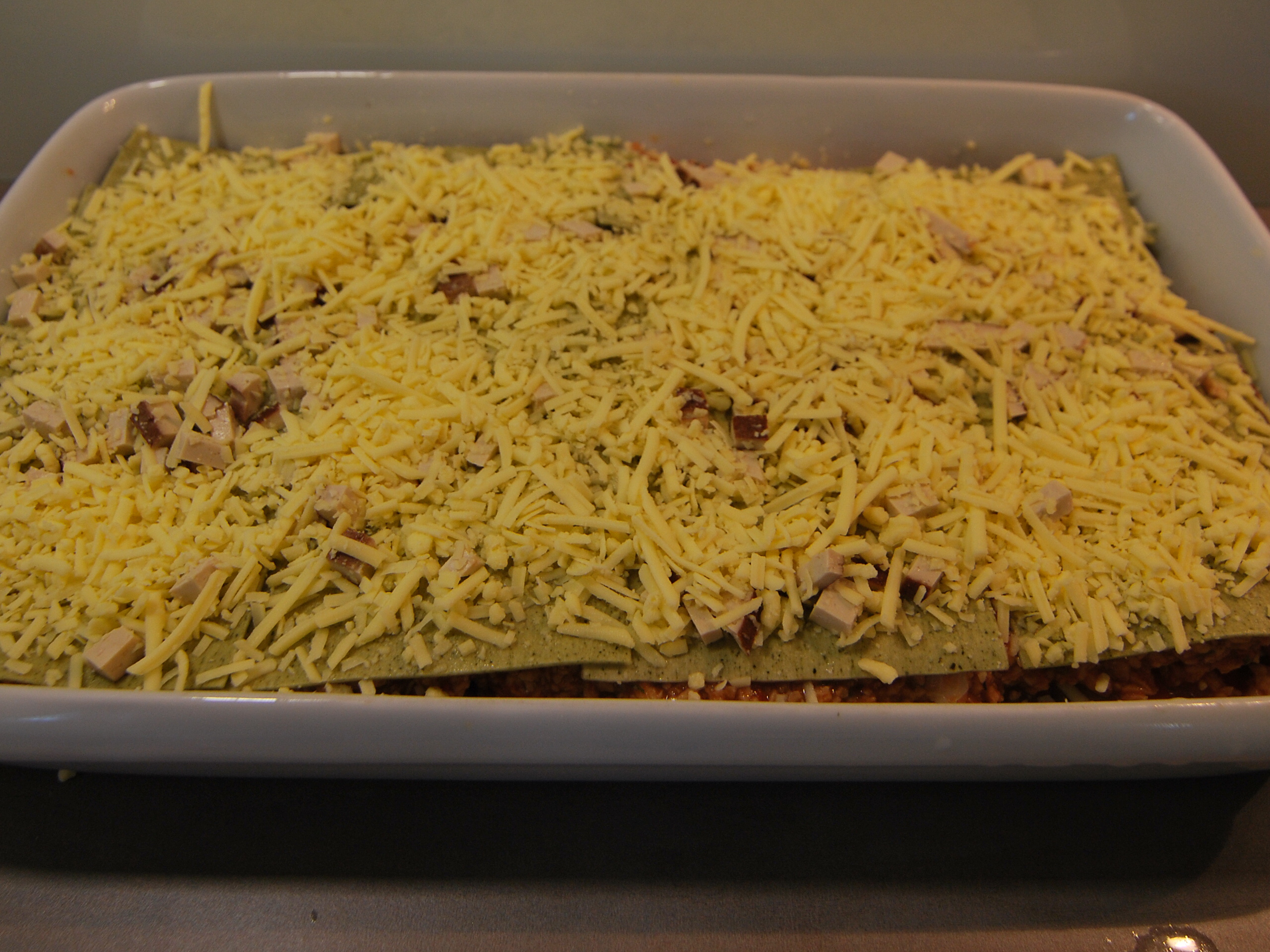 Wenn alles fertig ist, geht es ans Schichten: ich habe auf eine Lage Nudeln die Hälfte der Tomatensauce gegeben, dann einen Teil Käsesauce drauf gestrichen. Danach das Gleiche noch einmal und mit veganem Käse bestreut.