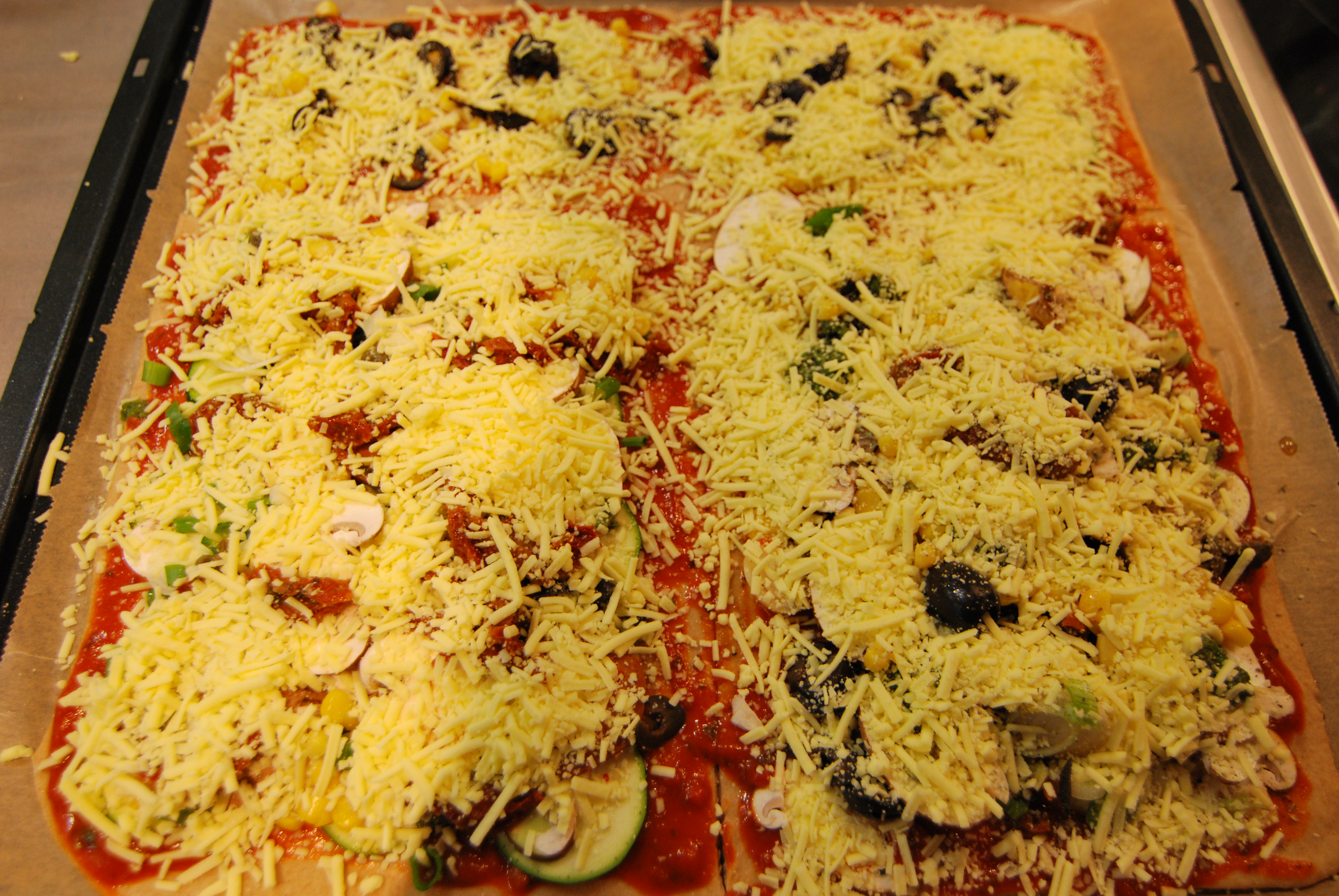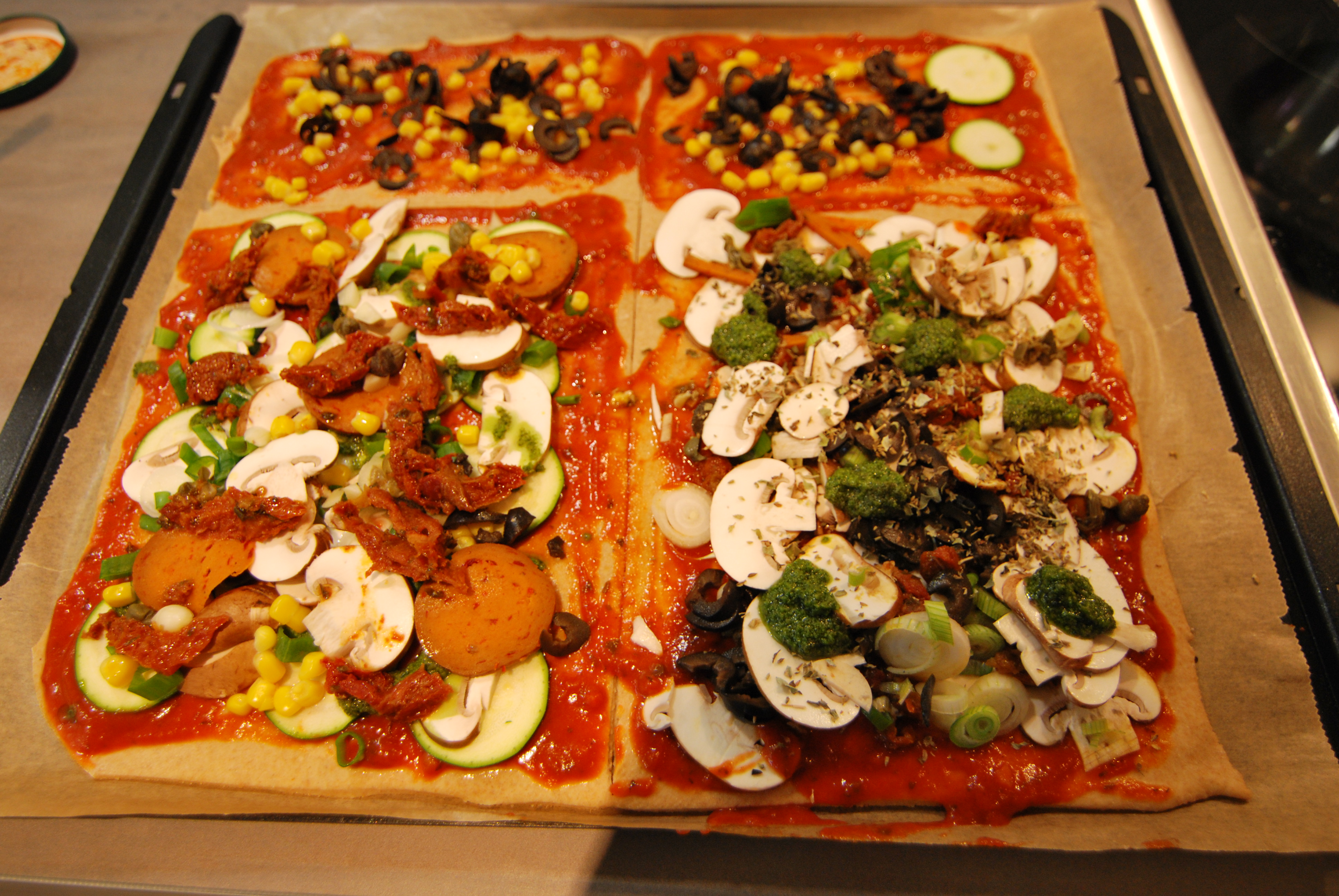 Zwiebeln, Knoblauch schälen, fein schneiden, mit Oregano, Paprika und dem Sojahack in Bratöl (4 EL) anbraten. Das dauert etwas, je nachdem wie „trocken“das Hack ist, etwas länger. Zwischdurch eventuell noch etwas Öl hinzufügen. Wichtig ist es, nicht zuviel Hitze zu nehmen und es nicht totzurühren, es muss später gebräunt und knusprig sein, sonst schmeckt es später matschig…