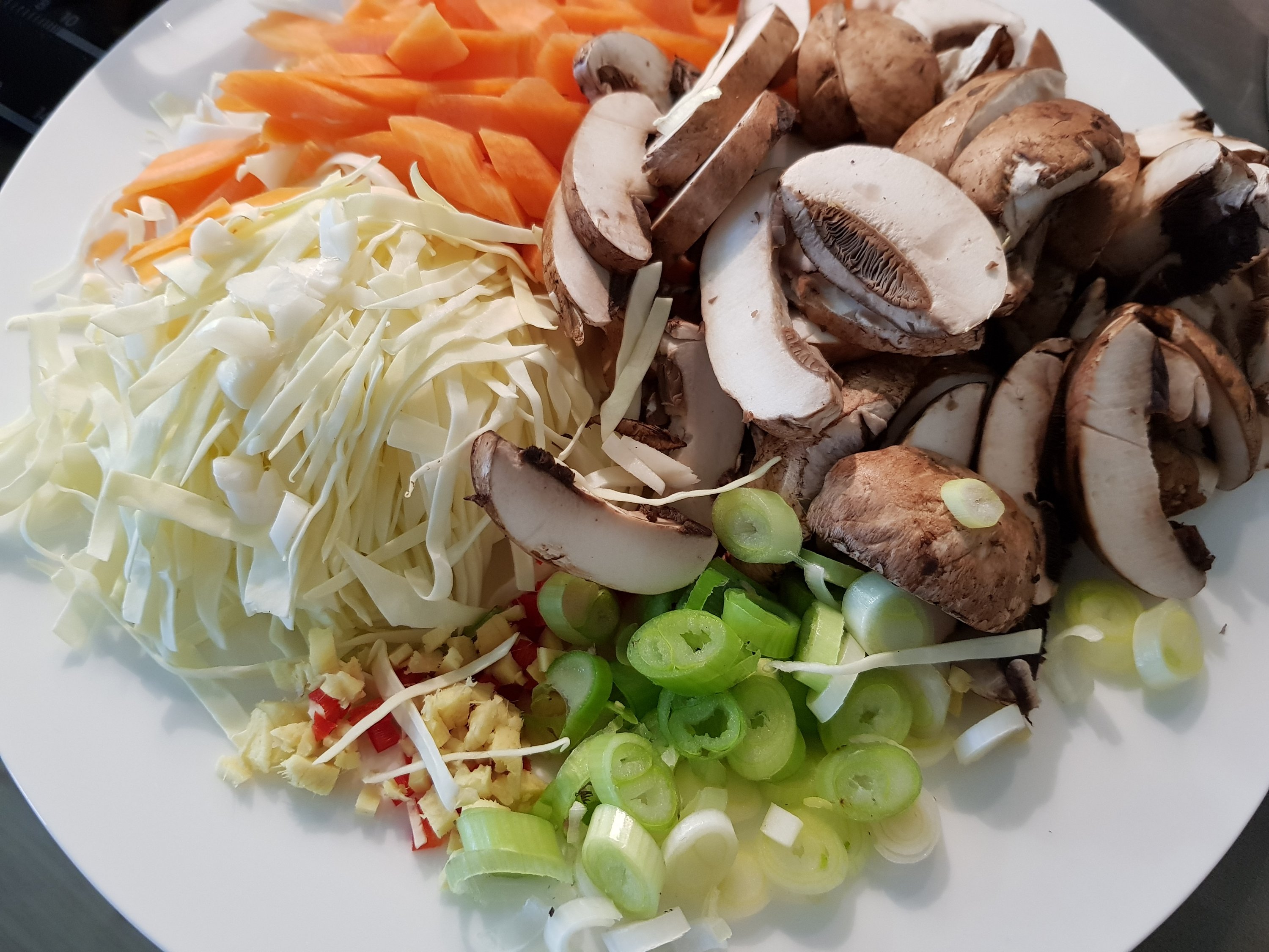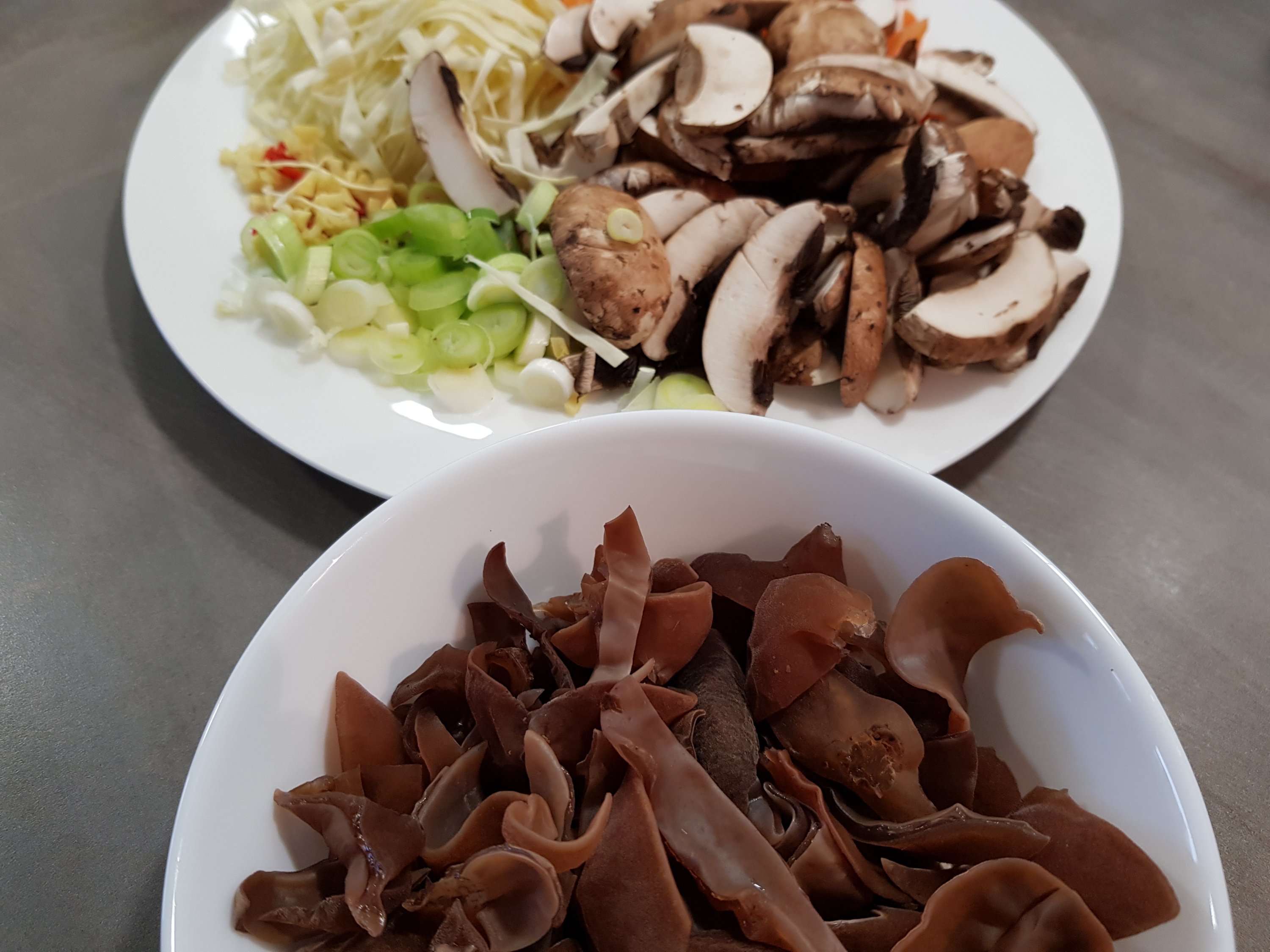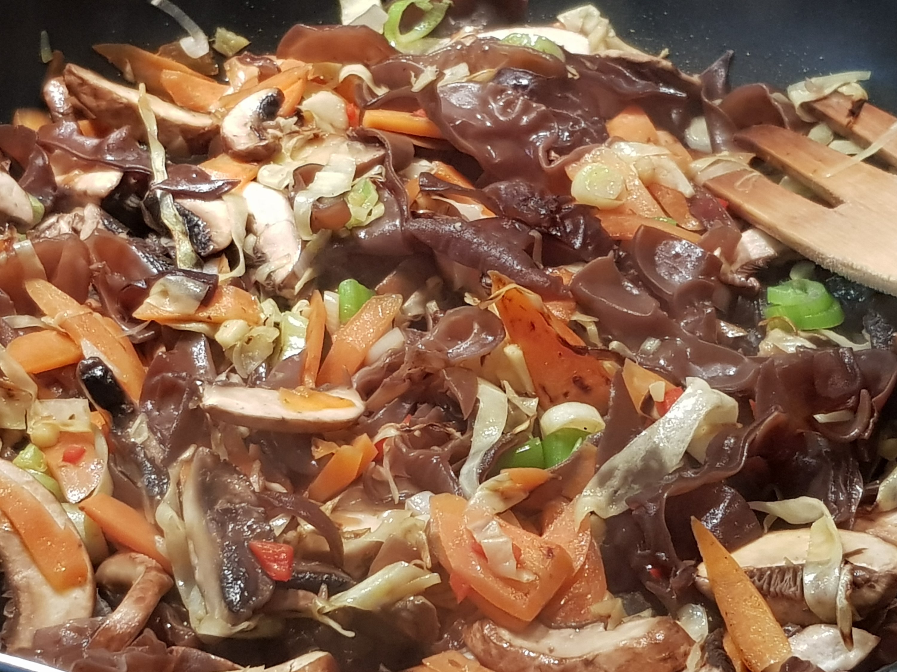 Die Judasohren waschen und wenn nötig einweichen. Das restliche Gemüse putzen und in feine Streifen schneiden, Knoblauch, Chili und Ingwer klein hacken. Den Kohl mit den Möhren zuerst scharf anbraten, die restlichen Zutaten hinzufügen und kurz mitbraten. Mit den Saucen ablöschen und abschmecken.