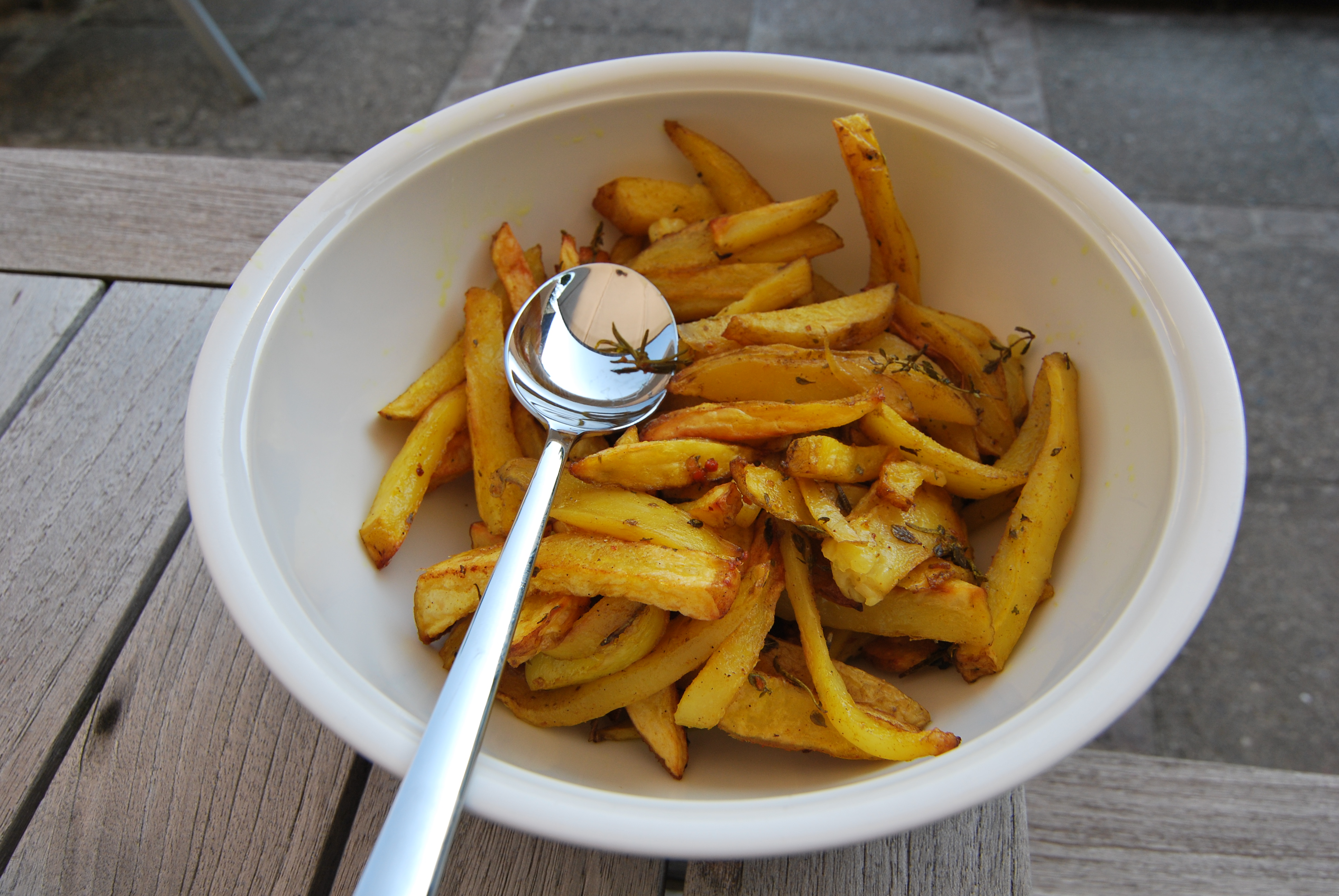 • selbstgemachte Pommes aus dem Ofen (gewürzt und in Öl gewendet)